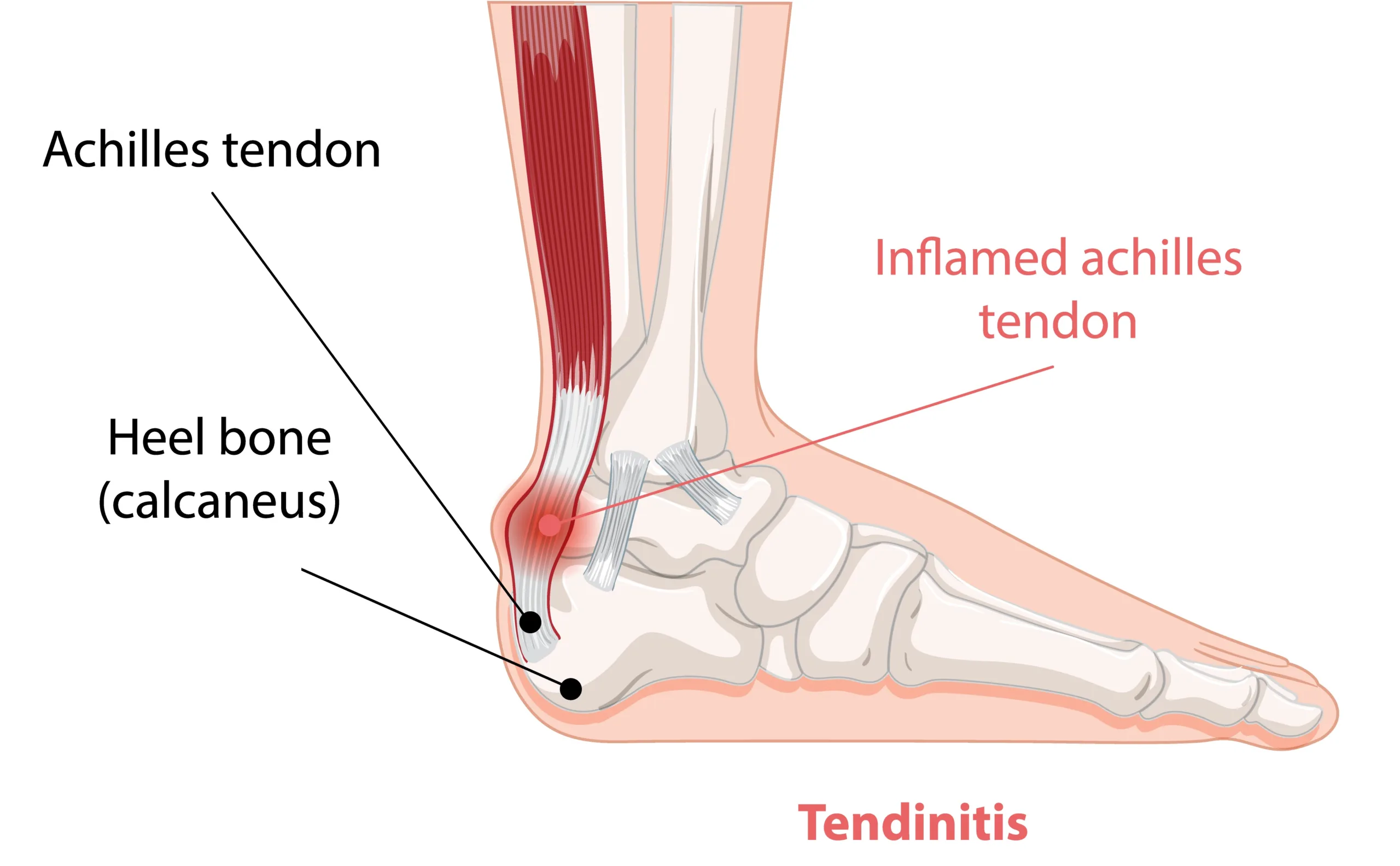 Inflammation of the Achilles tendon. Pain often appears at the back of the heel and increases with physical activity.